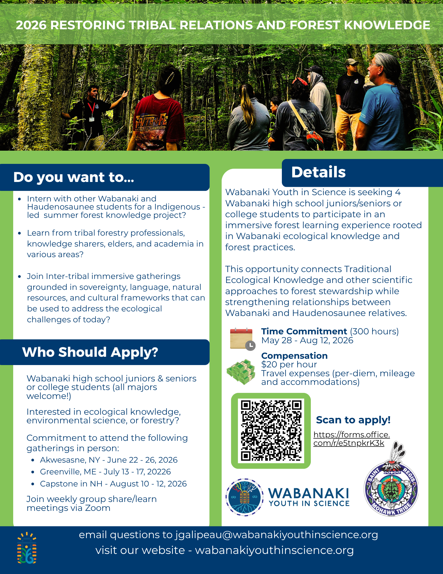 Restoring Tribal Relations and Forest Knowledge Internship. Applications close on April 24, 2026 The initiative brings together tribal forestry and natural resource practitioners, cultural knowledge sharers, elders, and academic partners in a supportive learning environment. Through these relationships, students will have opportunities to deepen their understanding of Indigenous Ecological Knowledge, build professional connections, and explore […]