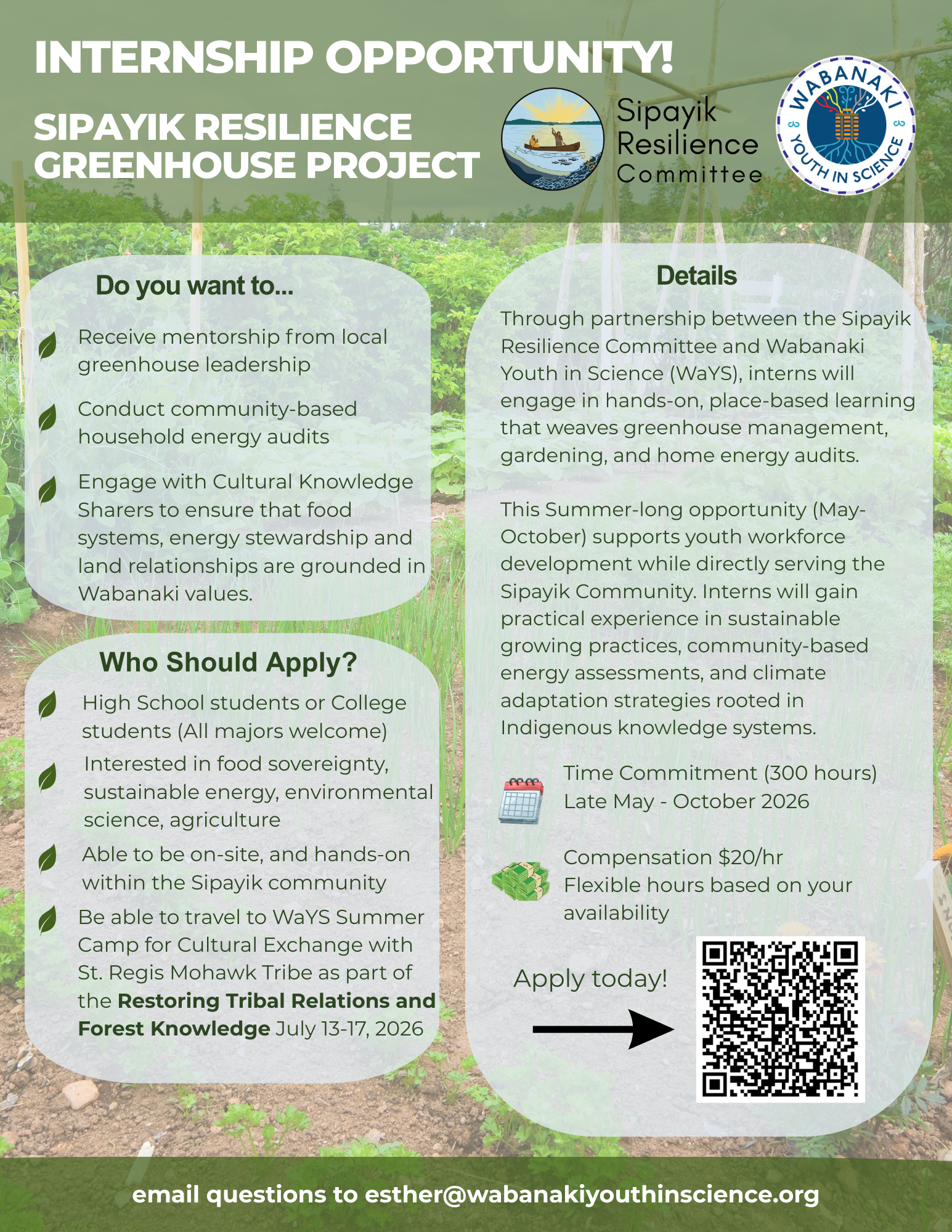 Through partnership between the Sipayik Resilience Committee and Wabanaki Youth in Science (WaYS), interns will engage in hands-on, place-based learning that weaves greenhouse management, gardening, and home energy audits. This Summer-long opportunity (May-October) supports youth workforce development while directly serving the Sipayik Community. Interns will gain practical experience in sustainable growing practices, community-based energy assessments, […]