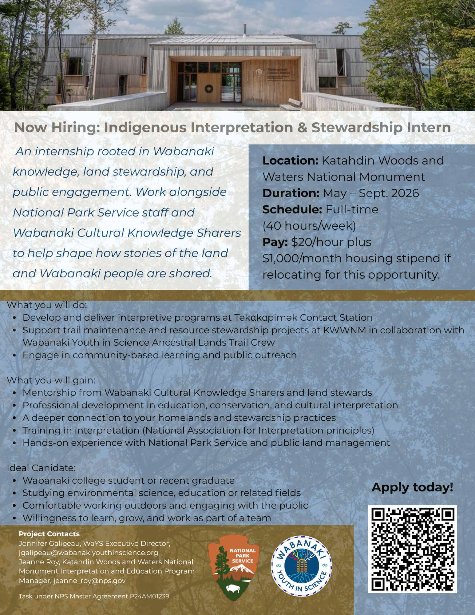 WaYS is looking to hire a Wabanaki college student for a hands-on internship rooted in Wabanaki knowledge, land stewardship, and public engagement. You will work alongside National Park Service staff and Wabanaki Cultural Knowledge Sharers to help shape how the stories of the land and Wabanaki people are shared. Location: Katahdin Woods and Waters National […]