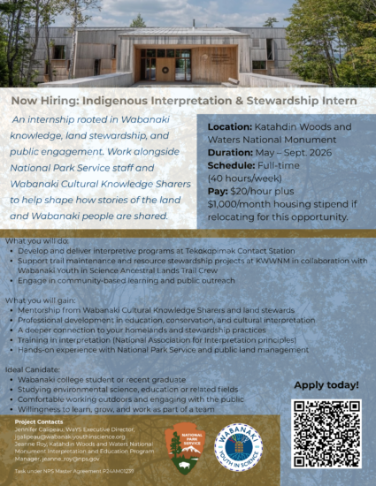 WaYS is looking to hire a Wabanaki college student for a hands-on internship rooted in Wabanaki knowledge, land stewardship, and public engagement. You will work alongside National Park Service staff and Wabanaki Cultural Knowledge Sharers to help shape how the stories of the land and Wabanaki people are shared.